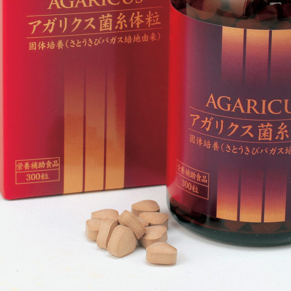 사탕수수를 짜고난 찌꺼기 「버개스」 배지로 충분히 고정 배양한 아가리쿠스 균사체를 열수 및 알코올 등으로 추출하여 얻은 추출물을 분말화한 후 알갱이로 완성한 영양보조 식품입니다.