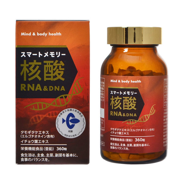 「鲑魚精核酸」是一種含鋅的營養機能食品。由含RNA的啤酒酵母提取物、含DNA的鲑魚精提取物、11種的維生素、3種礦物質配合而成。更含有黃金菇提取物粉末和銀杏葉提取物粉末。■12粒(3.6g)中