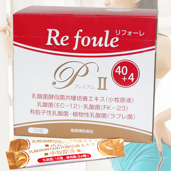 「Re foule PremiumⅡ」是由16種乳酸菌和24種酵母菌,以彼此的精華爲基礎,發酵繁殖而成的分解物(乳酸菌酵母菌生産物)作爲原料,精制而成的保健品。在「乳酸菌酵母菌分解物」的基礎上、按有效比例配合了有胞子性乳酸菌、植物性乳酸菌(labre菌),乳酸菌(EC-12)、乳酸菌(FK-23)。