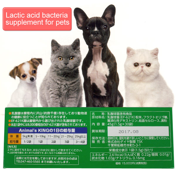 「Animal's KING」是精选乳酸球菌(EF-621K菌),并配合低聚糖及食物纤维等制成的一款宠物专用乳酸菌营养保健食品。