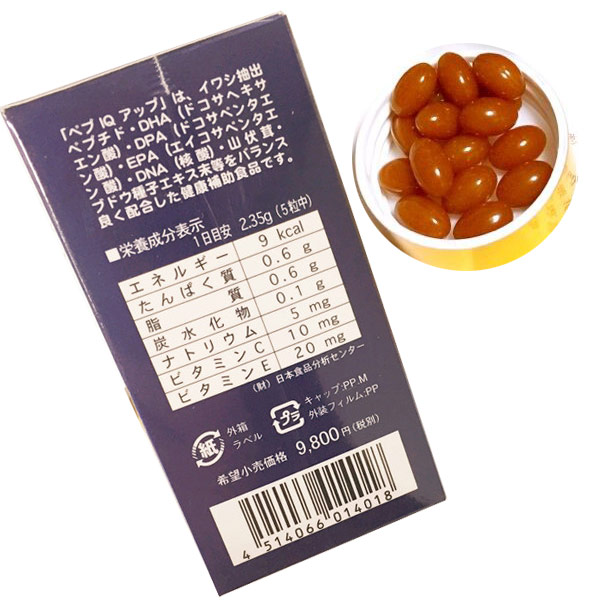 沙丁鱼提取缩氨酸「IQ提高」采用沙丁鱼提取缩氨酸、DHA(二十二碳六烯酸)、DPA(二十二碳五烯酸)、EPA(二十碳五烯酸)、DNA(核酸)、猴头菇、葡萄种子提取物等制成的营养辅助食品。■5粒(2.35g)中含
