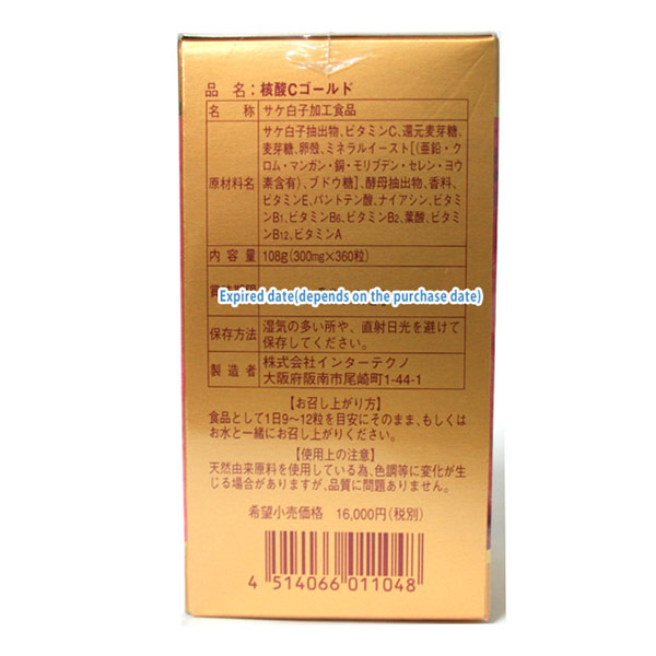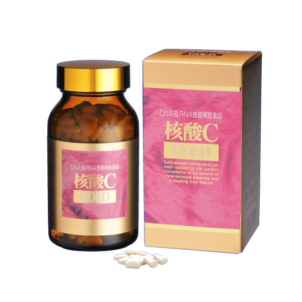 「金装核酸C」采用从含DNA丰富的鲑鱼精中提取出的纯度高达95%的DNA和从酵母提取物中精制的纯度高达91%的RNA为主要成分、搭配维生素C、B群及矿物质等身体必需营养物质,精制而成。苹果口味,是易于食用的营养补助食品。